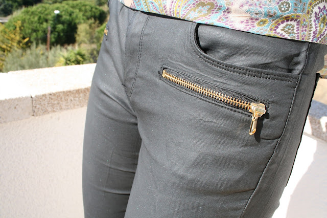 ¿En qué armarios no encontramos un pantalón negro de vestir? Es un básico. Los podemos ver combinados con blusas, jerseys... Para romper la sobriedad de este color, lo hacemos mediante estampados o con una camiseta simple pero que tiene un toque distintivo (se usa mucha pedrería en las prendas). En este look hemos apostado por pocos complementos ya que queremos darle protagonismo a la parte superior del conjunto.